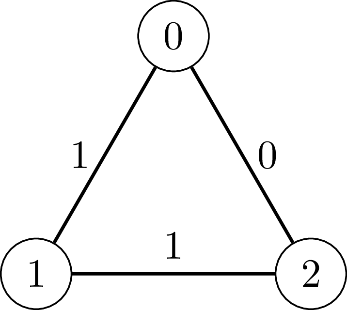 [0, 1, 1]: We add the edge between vertex 0 and vertex 1 with weight 1.[1, 2, 1]: We add the edge between vertex 1 and vertex 2 with weight 1.[0, 2, 0]: We add the edge between vertex 0 and vertex 2 with weight 0.0 - 1 - 2 - 0 has total edge weight 1 + 1 + 0 = 2, which is an even number.Constraints: